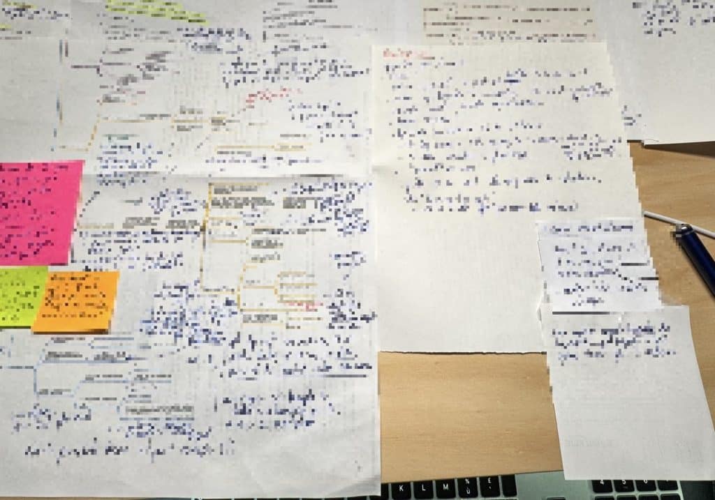 Des post-its, des mind maps, et ma pratique depuis deux ans : construire des feuilles qui se déploient dans tous les sens à coup de scotch selon la direction (très matérielle) de mes idées. Et tout ça, ici, juste pour une seule scène (importante et longue, mais quand même). La maison reste ouverte pendant les travaux, ou bien les travaux ouvrent la maison, tout a dépassé les bornes de la raison, yahou.