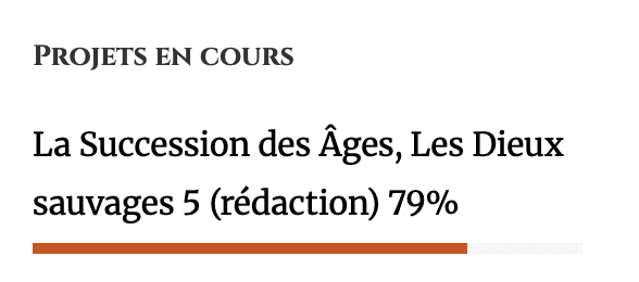 Reçu quelques petits pincements au cœur concernant la jachère des barres de progrès : certain·es (bon, OK, trois personnes qui se sont signalées, mais hé, salut) y accordent une réelle attention, et ça heurte aussi mon OCD de les laisser comme ça à ne plus rien signifier de concret. Donc : les barres de progrès du livre ont été remises à jour et simplifiées pour refléter autant que possible la réelle avancée du dernier tome de « Les Dieux sauvages ».