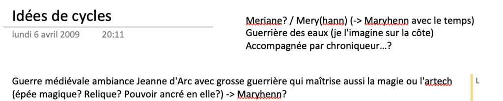 On me passera l’expression « grosse guerrière », c’est mes notes perso, je me comprends, hein. C’est marrant de constater que certains éléments sont restés (Jeanne d’Arc évidemment, mais même Maragal était présent depuis le début !), d’autres pas du tout (j’ai fini par évacuer la dérive orthographique, qui s’est retrouvée à la place dans le nom Rhovelle / Rhovel, et Mériane n’est pas du tout une guerrière des eaux au final…)