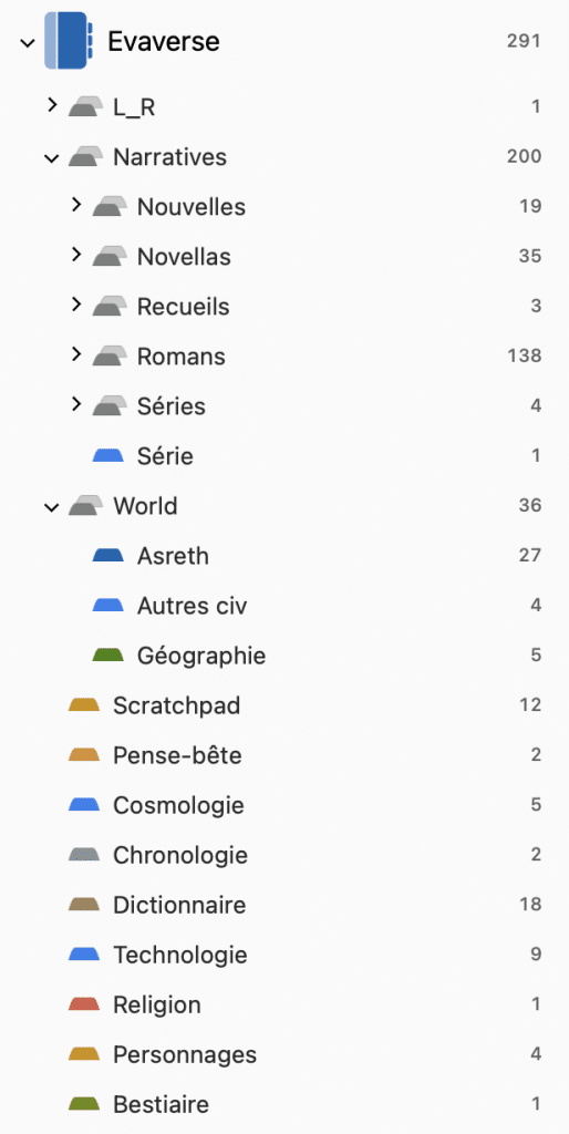 Or, jadis, j’utilisais OneNote pour tout, comme j’utilisais autrefois Evernote, et aujourd’hui Bear. Notamment, toutes les notes de l’univers d’Évanégyre s’y trouvaient centralisées de 2009 à 2014 environ (et que j’ai continué à développer de loin en loin, certaines infos ne se trouvant que là, d’où l’importance), ce qui donnait ça :